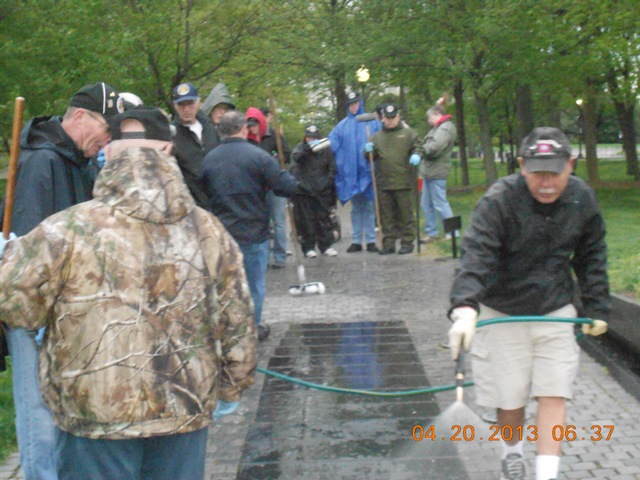 The Vietnam Memorial (The Wall) was given its monthly bath Saturday April 20, 2013. Participating was a Vet group from Michigan and the Silver Spring, MD., Viet Nam Veterans of America including our buddy Charlie Shyab. The wall was thoroughly scrubbed and completed by 8:00am.