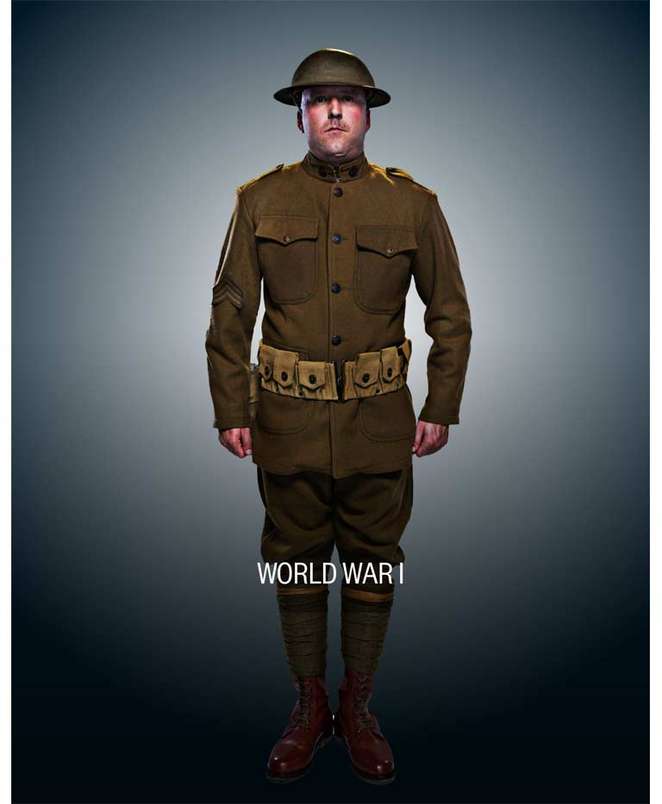 Uni1WWI – Soldiers wore the M1912/17 uniform which ranged in color from medium brown and mustard brown with a hint of green. As the war progressed, the uniforms became greener. They had stand-up collars, four patch pockets with single-point flaps, and steel trench helmets.