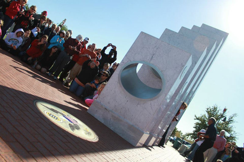 Once a Year at 11:11 am the Sun Shines Perfectly on this Memorial At precisely 11:11 a.m. each Veterans Day (Nov. 11), the sun’s rays pass through the ellipses of the five Armed Services pillars to form a perfect solar spotlight over a mosaic of The Great Seal of the United States.