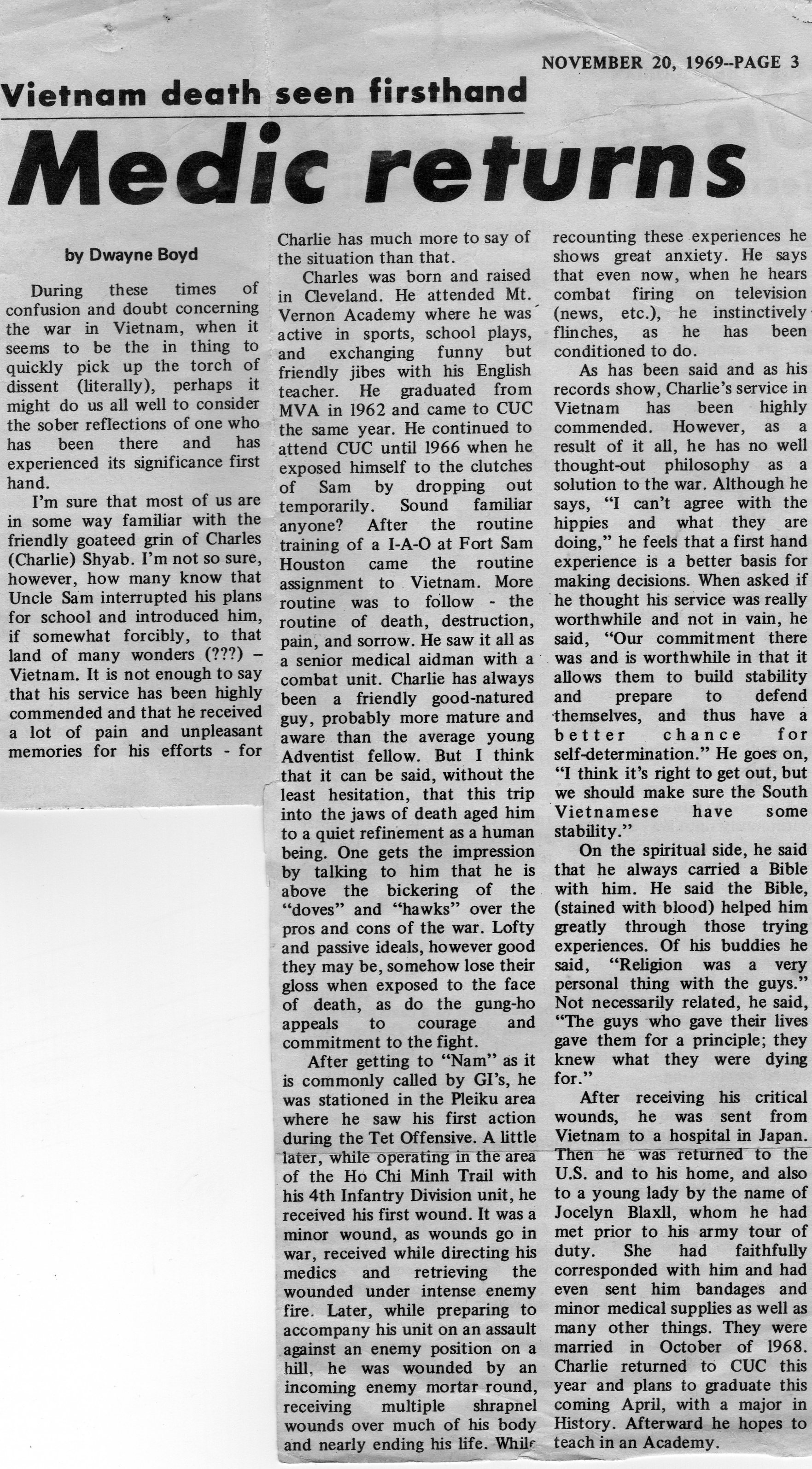 Charles was born and raised in Cleveland. He attended Mt. Vernon Academy where he was active in sports, school plays, and exchanging funny but friendly jibes with his English teacher. He graduated from MVA in 1962 and came to CUC the same year. He continued to attend CUC until 1966 when he exposed himself to the clutches of Sam by dropping out temporarily. Sound familiar anyone? After the routine training of a I-A-O at Fort Sam Houston came the routine assignment to Vietnam. More routine was to follow – the routine of death, destruction, pain, and sorrow. He saw it all as a senior medical aidman with a combat unit. Charlie has always been a friendly good-natured guy, probably more mature and aware than the average young Adventist fellow. But I think that it can be said, without the least hesitation, that this trip into the jaws of death aged him to a quiet refinement as a human being. One gets the impression by talking to him that he is above the bickering of the “Doves” and “Hawks” over the pros and cons of the war. Lofty and passive ideals, however good they maybe, somehow lose their gloss when exposed to the face of death, as do the gung-ho appeals to courage and commitment to the fight.