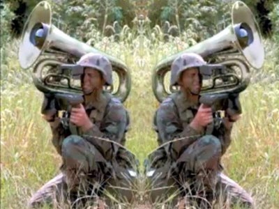 Check out the tuba brigade just hanging out in the bushes. These two are trying to go as incognito as possible as they spy on the enemy. I do not understand why they are using tubas unless they are spying on a band camp!