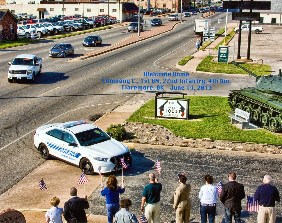 On Friday June 14, 2013 during our Reunion 2013 in Tulsa, Oklahoma we visited Claremore, Oklahoma for the day. We were surprised to a special treat when the Rogers County Sheriffs Department and the Claremore Police Department escorted us on Route 66 to Claremore. We finally had our homecoming parade and no veterans had a dry eye.