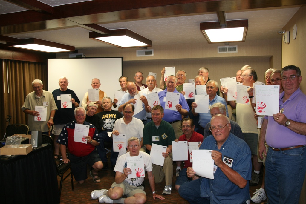 RAYMOND WARNER (kneeling bottom right), a local Vietnam Veteran, recently attended his 4th Infantry Reunion in Tulsa. He personally delivered “Thank You Soldier” notes that had been made by the children of The Crossing Church to the combat veterans. Many, still having memories of being spat upon when they returned from the war, were deeply moved by the children’s efforts acknowledging their service to their country. Most attending were Purple Heart Recipients. “Greater love has no one than this, that one lay down his life for his friends.” – John 15:13